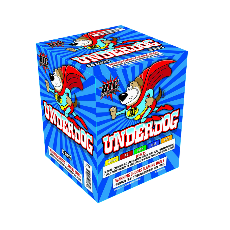 16 Shot - Cardinal red dahlia/lemon dahlia with gold chrysanthemum; ti-gold palm to green or blue, finale 4 of king brocade with red strobe.